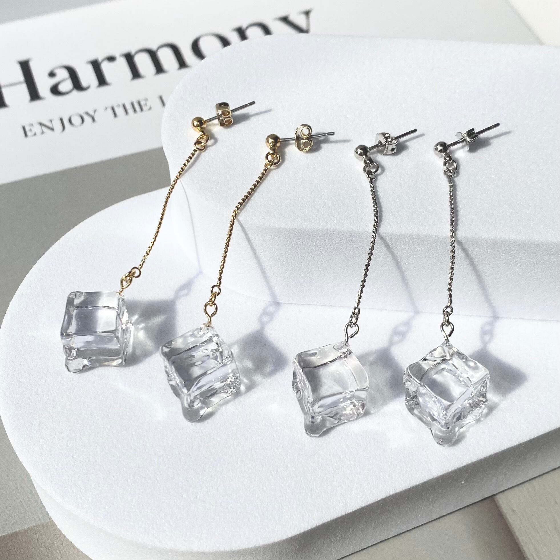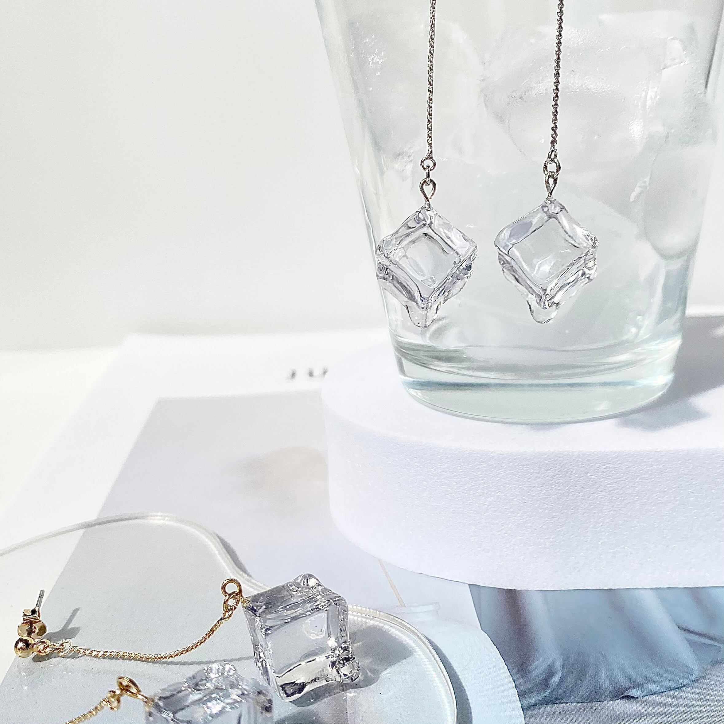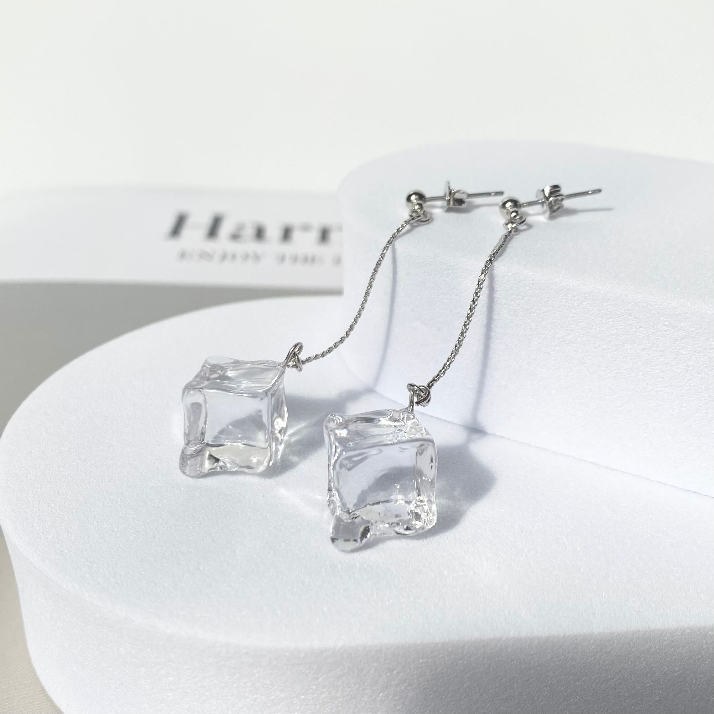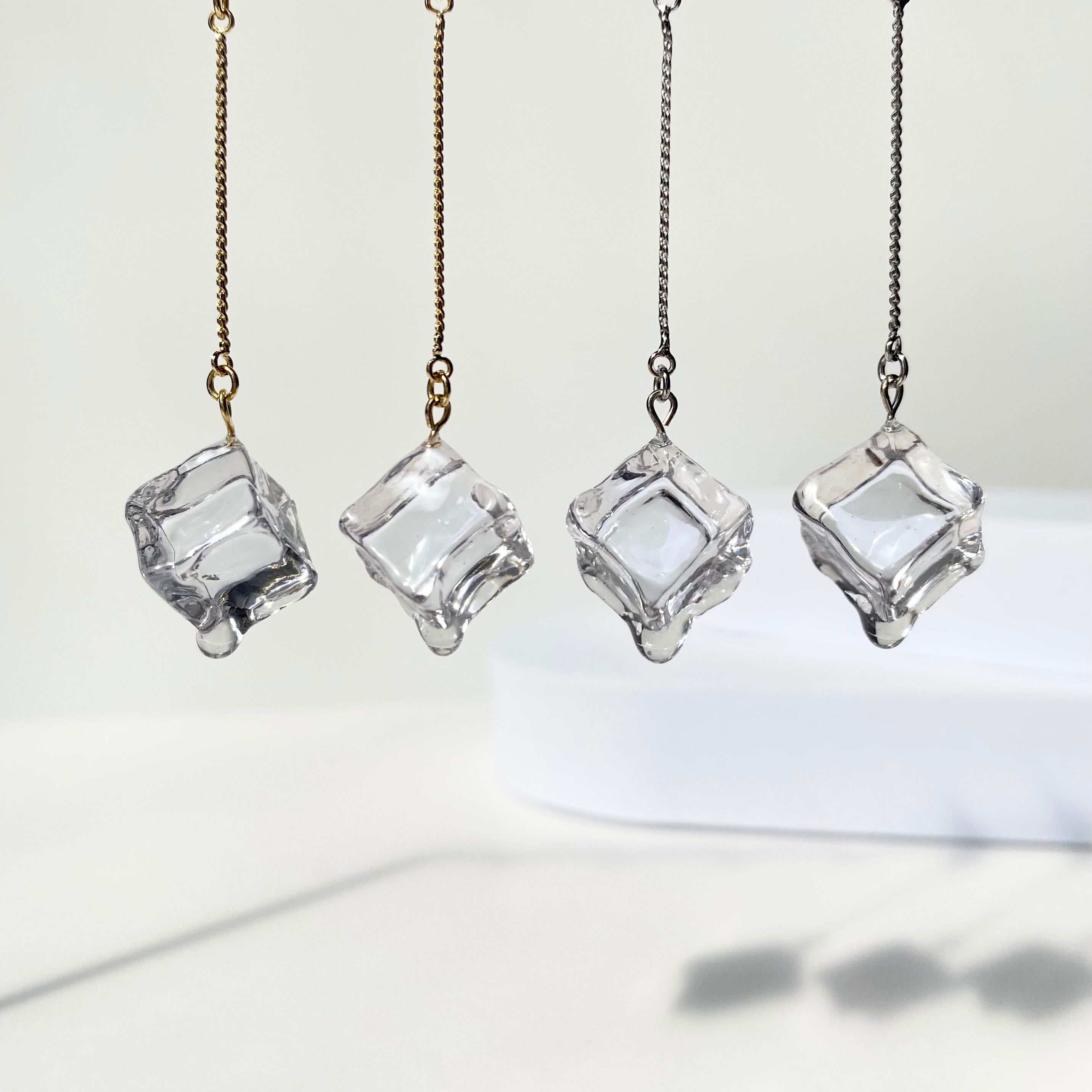 したたる水滴が本物の解けてきた氷のようなピアス、イヤリングです。