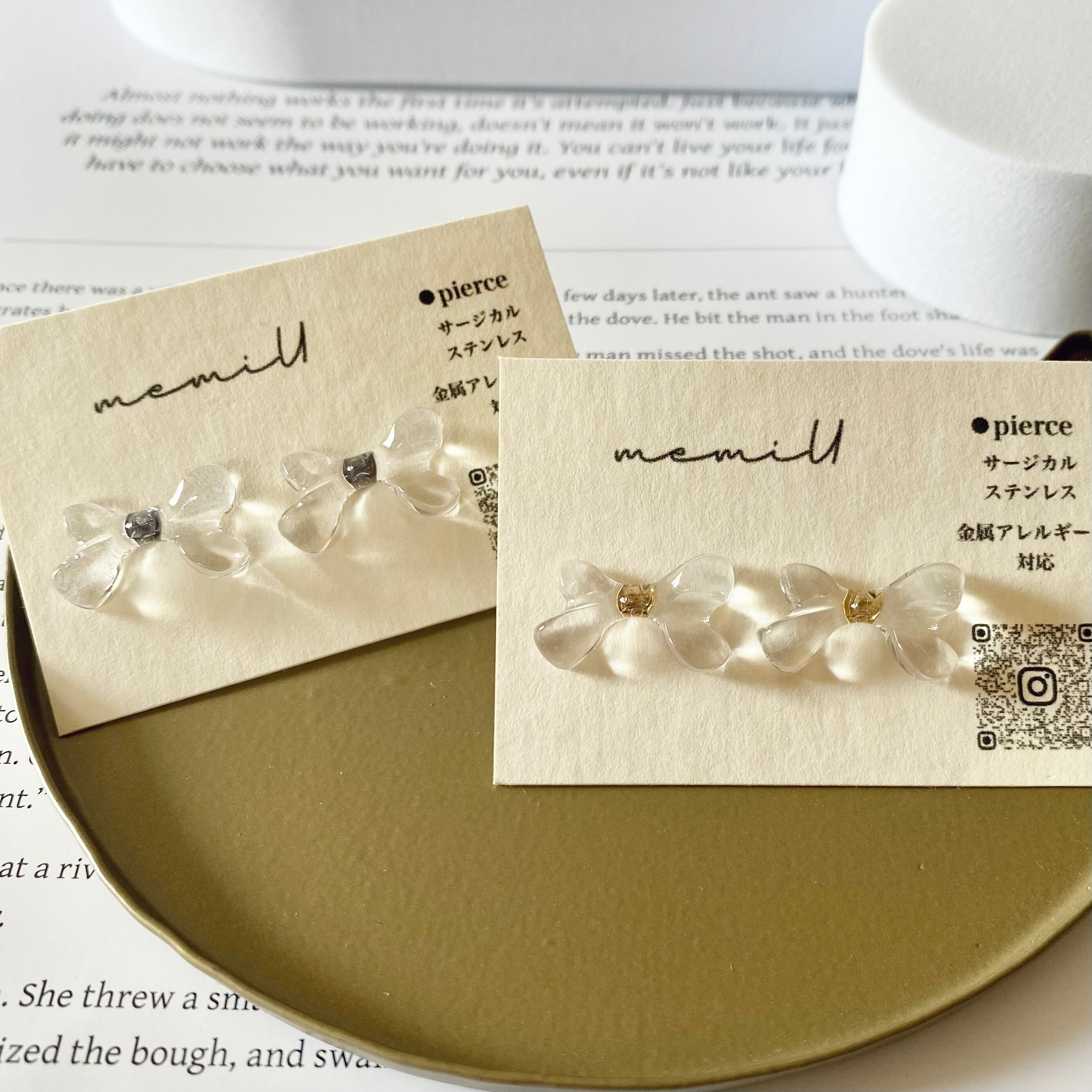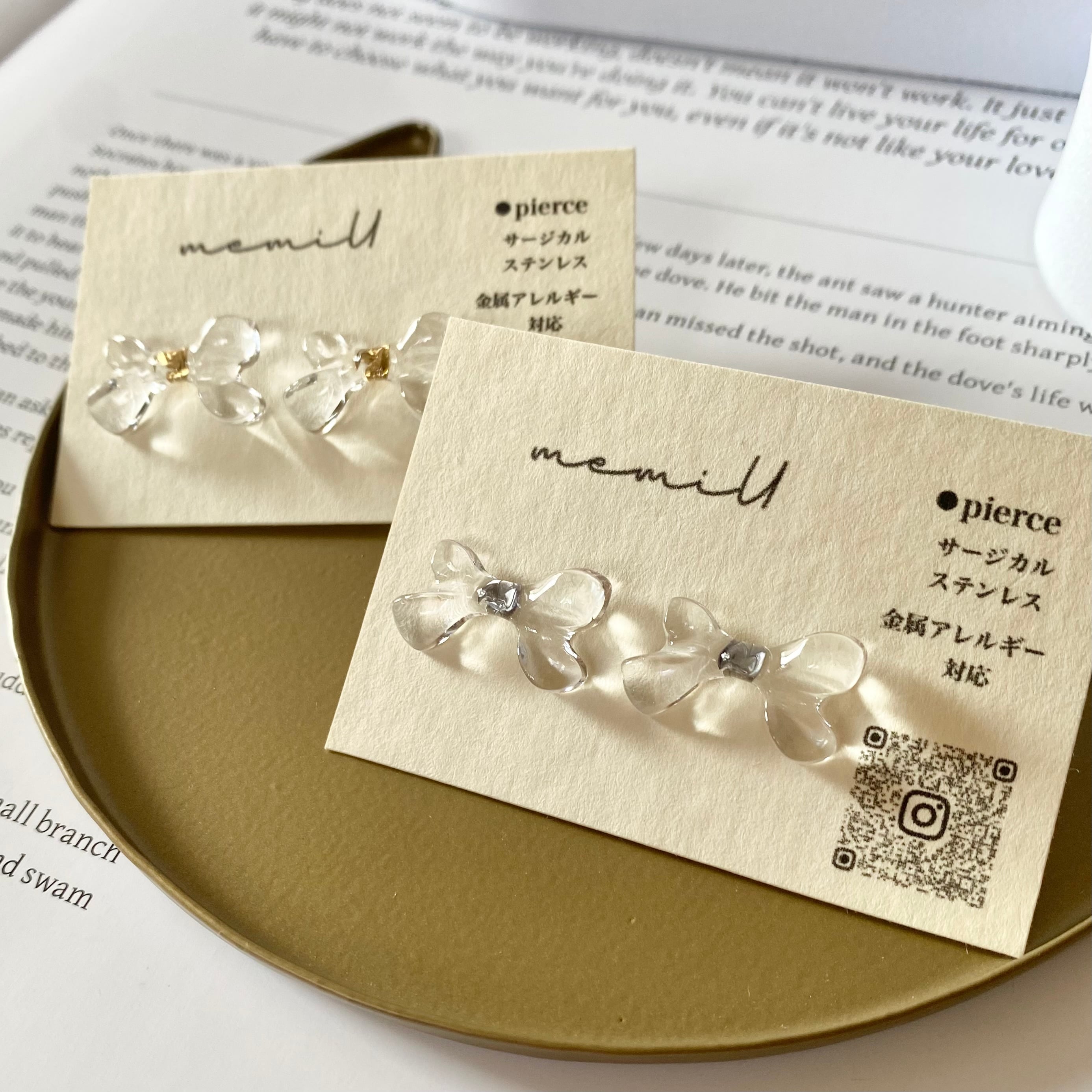 カラーは透明ですが、金具をゴールドもしくはシルバーの2色からお選びいただくことでアクセサリーの見た目が変わります。