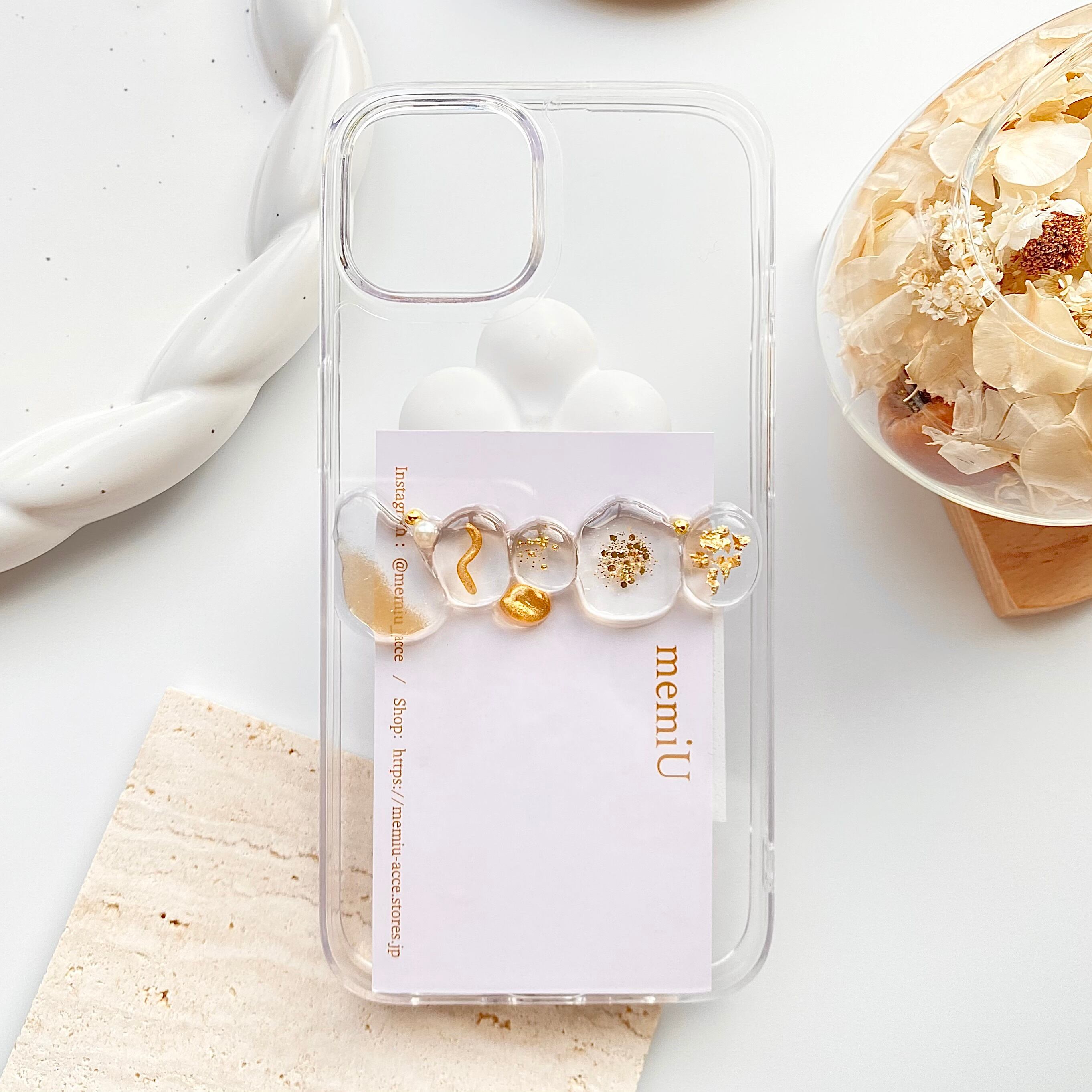 全体をゴールドでまとめた中に、一粒の白いパールが可愛らしさを出してくれる、大人かわいいケースに仕上がっています ୨୧