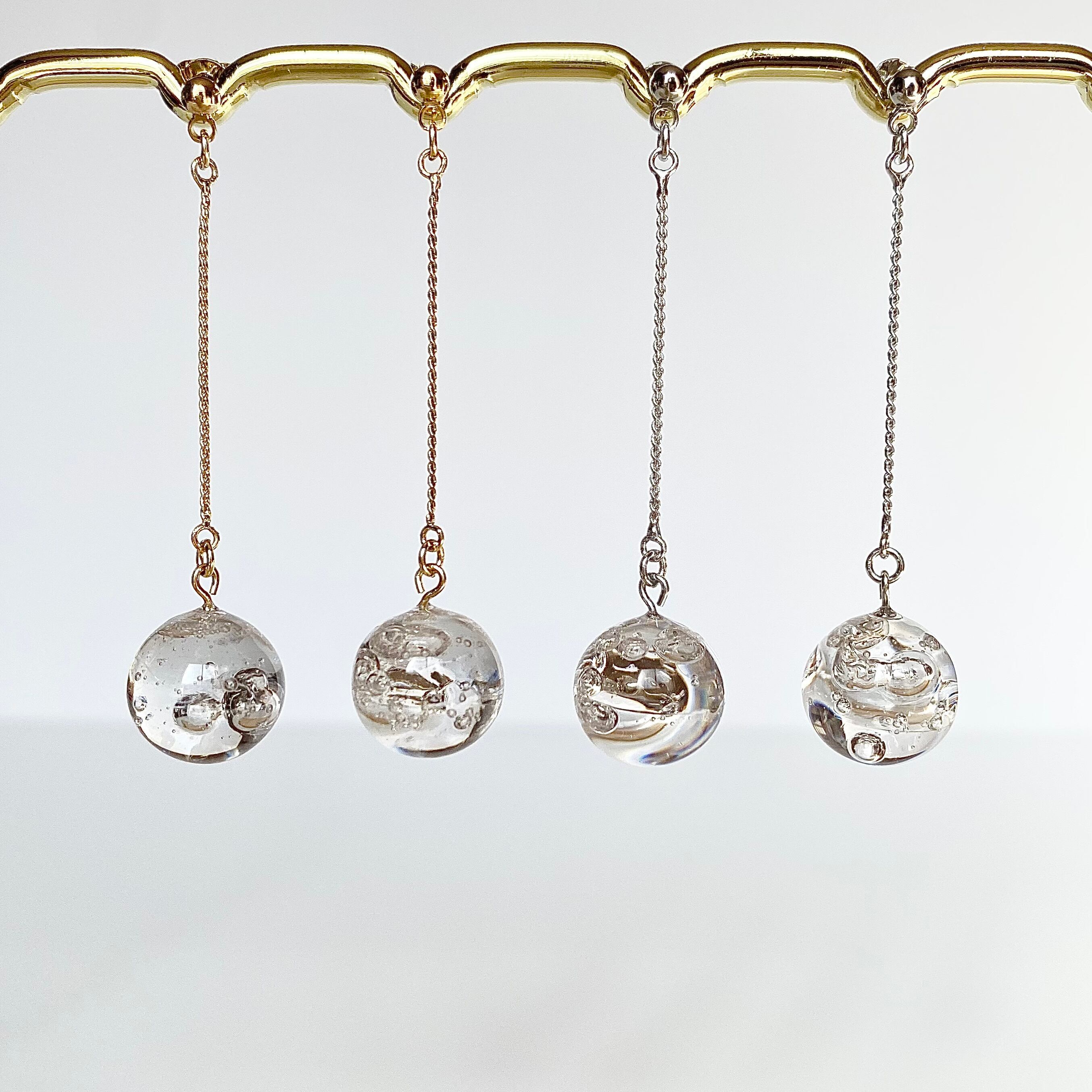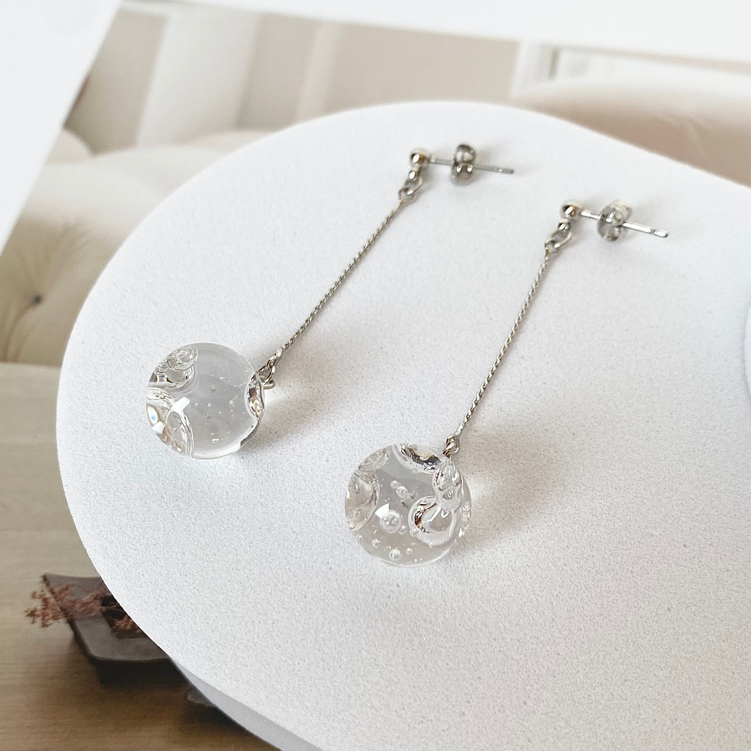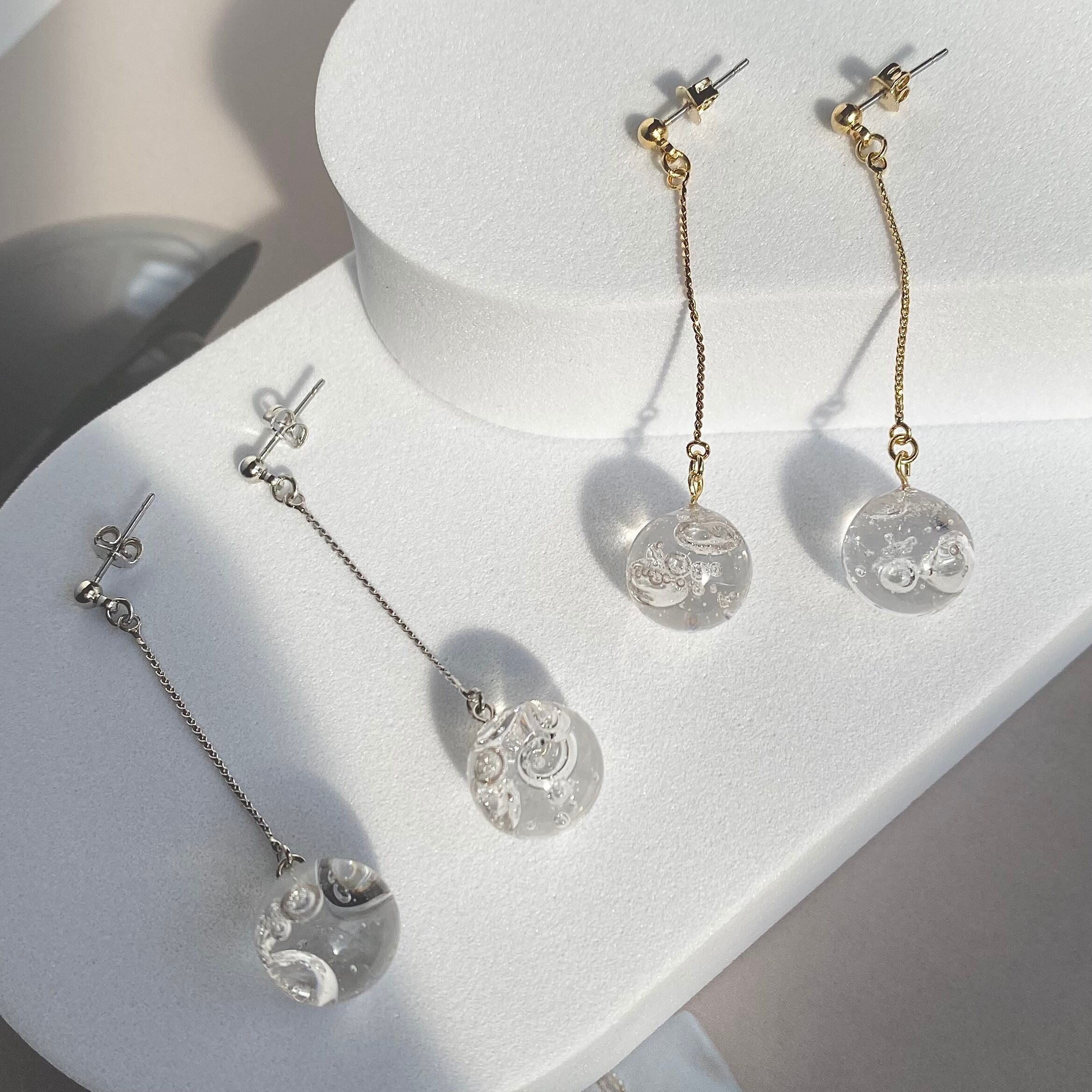 透明で艶々のtubu.(粒)の中に気泡を泡のように閉じ込めたピアス、イヤリングです。